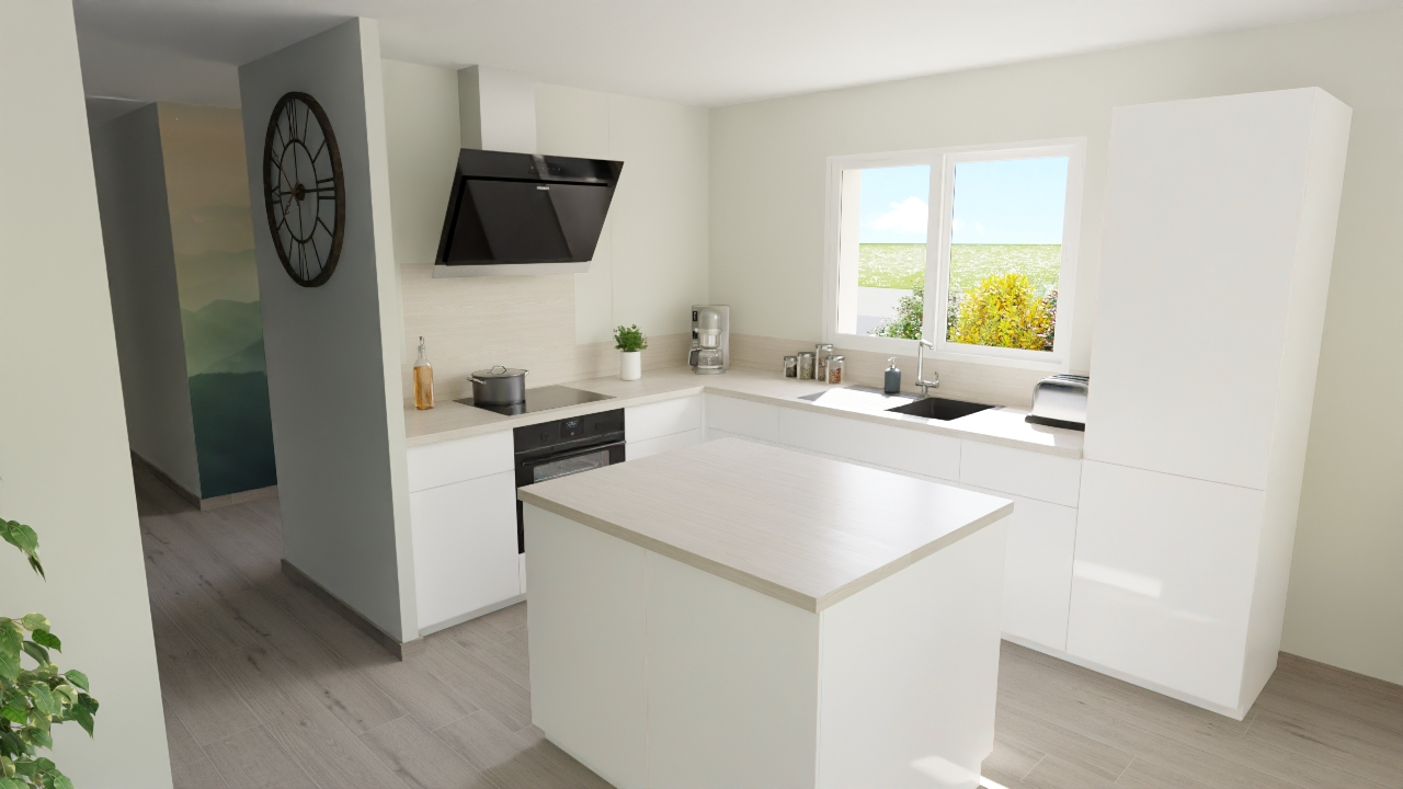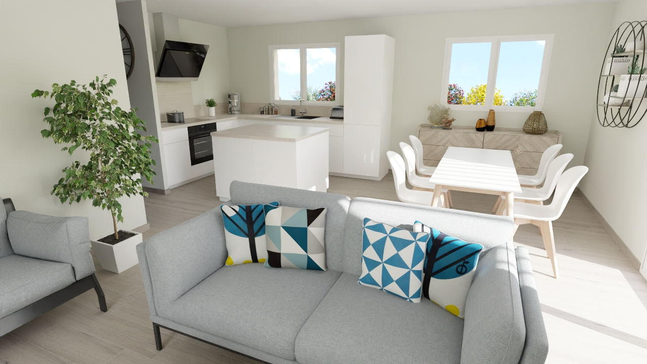 Projet totalement personnalisable sur la base de 3ch avec placards intégrés, SBD avec douche italienne, double vasques, WC séparés, pièce de vie spacieuse avec cuisine ouverte