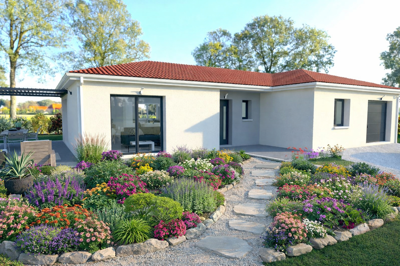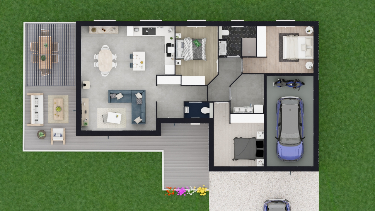 Projet totalement personnalisable, 3ch avec placards intégrés, SBD avec douche, vasque et WC suspendus, un 2eme WC séparés, pièce de vie spacieuse avec cuisine ouverte, cellier et garage.
